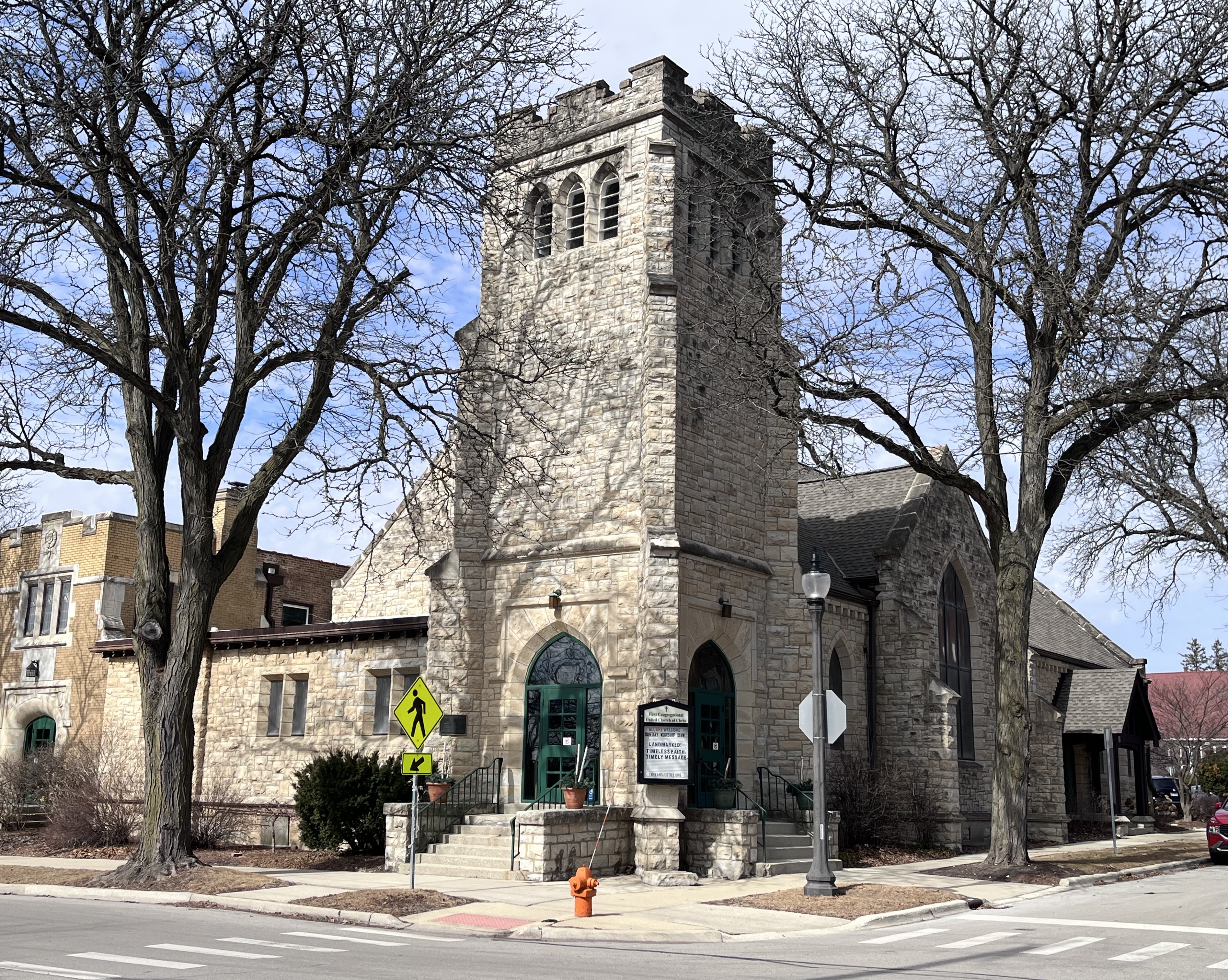 The building is home to First Congregational, the oldest church in DuPage County, which was founded in 1833. The original church, constructed in 1846 on land donated by Morris Sleight, was replaced by the existing limestone structure referred to as the "1906 Building." Many of the members of the congregation, past and present, are of significance in national, state and local history.