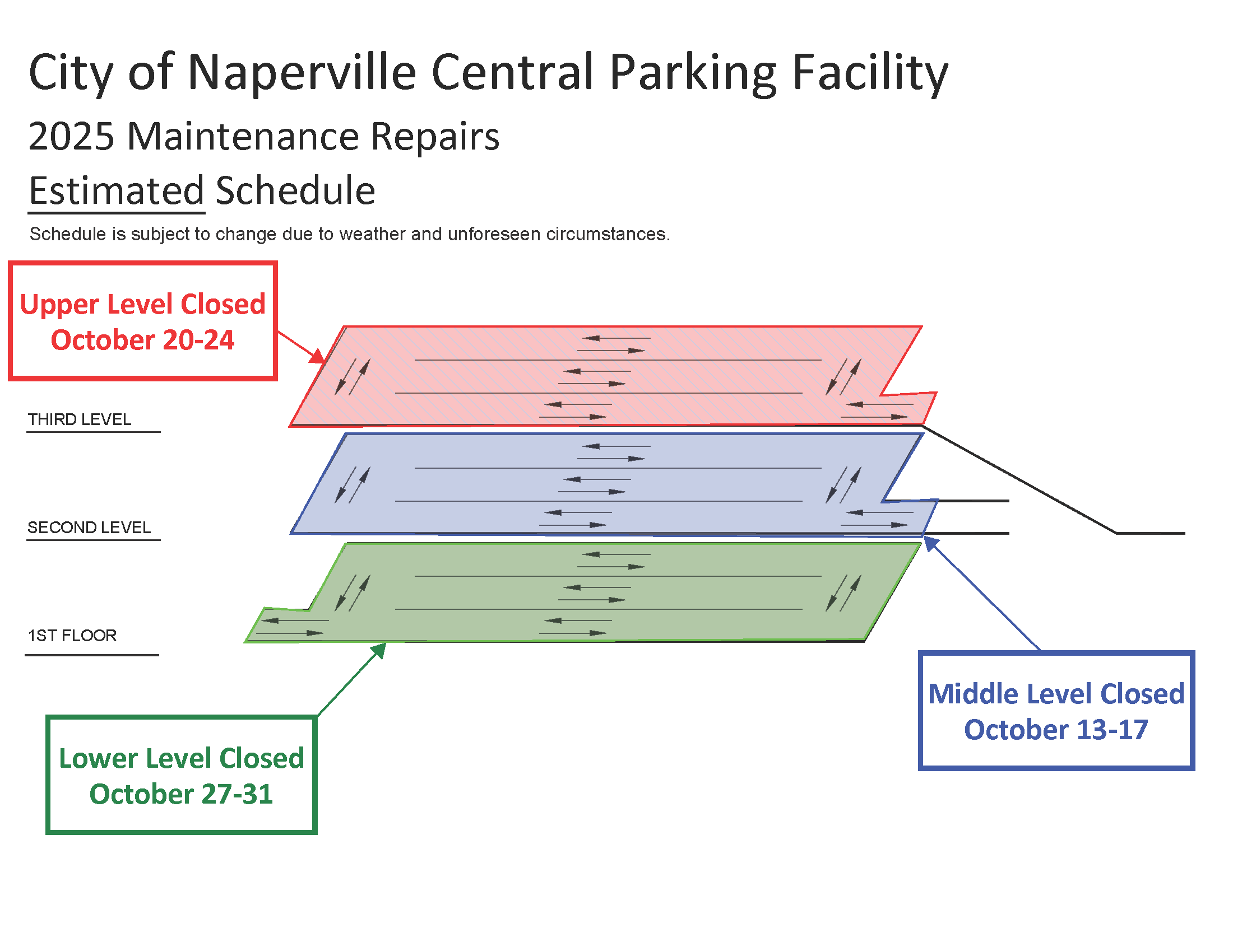 The City has contracted with J. Gill and Company to perform maintenance on the Central Parking Facility, located at 75 E. Chicago Ave. The work will consist of minor concrete repairs on the first and second levels, and the top floor will be recoated and striped to ensure the water membrane remains intact.