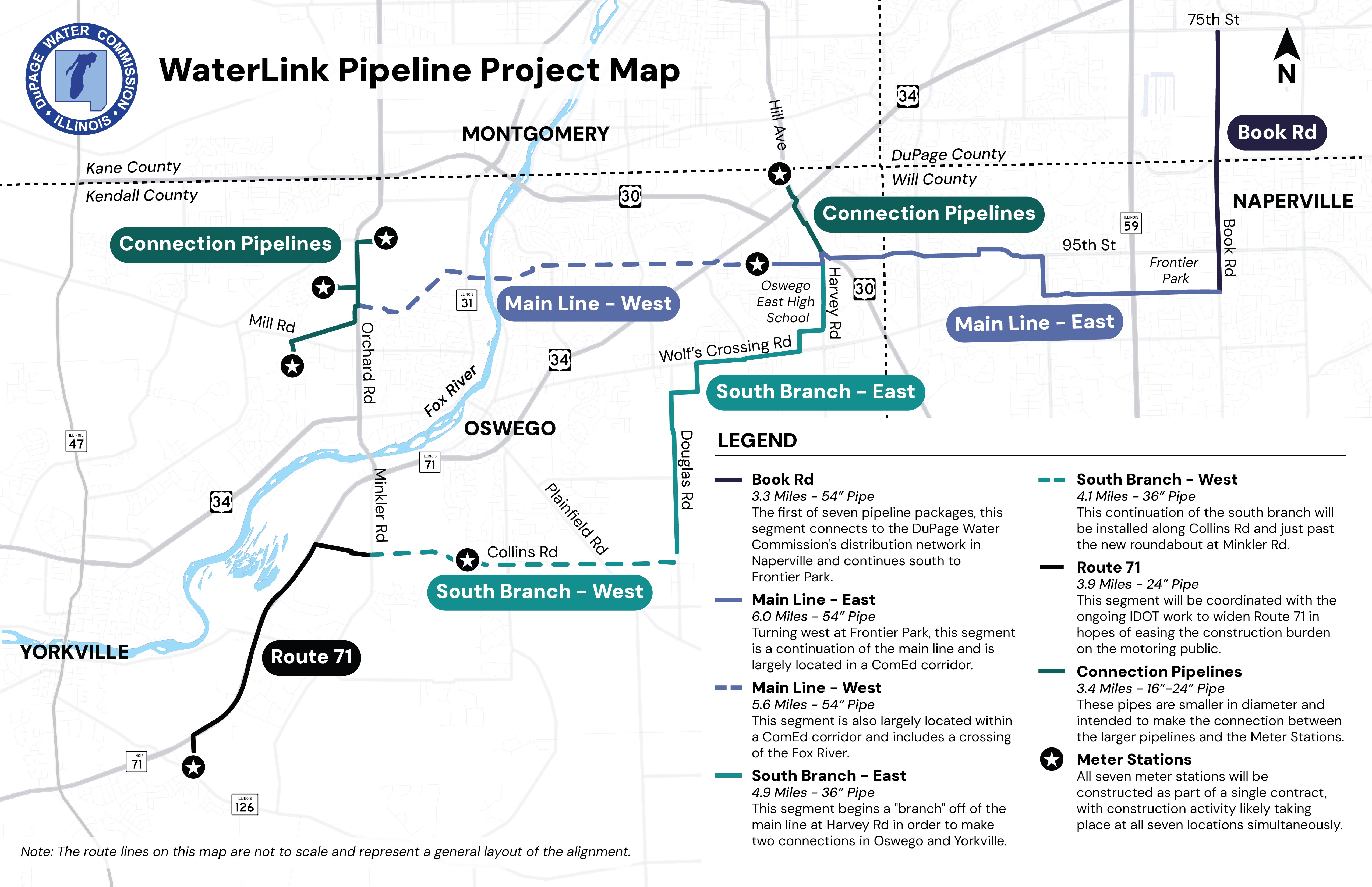 The DuPage Water Commission (DWC) is expanding its infrastructure to bring Lake Michigan drinking water to the communities of Montgomery, Oswego, and Yorkville. The WaterLink project will design and construct a 30-mile water main extension that begins in Naperville and continues west through multiple connection points. For more information on the Waterlink Project, or to sign up for DuPage Water Commission construction updates, visit www.waterlinkpipeline.com. For questions, email info@waterlinkpipeline.com or call the project hotline at (630) 576-9997.