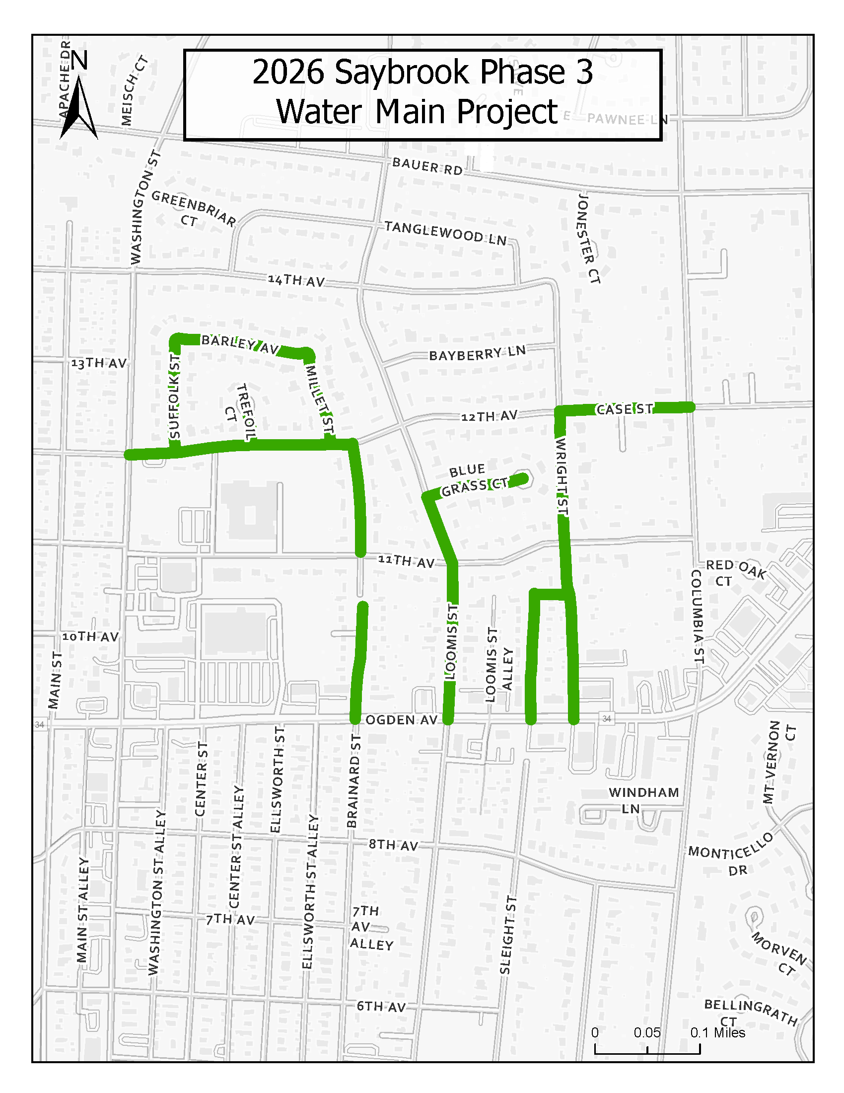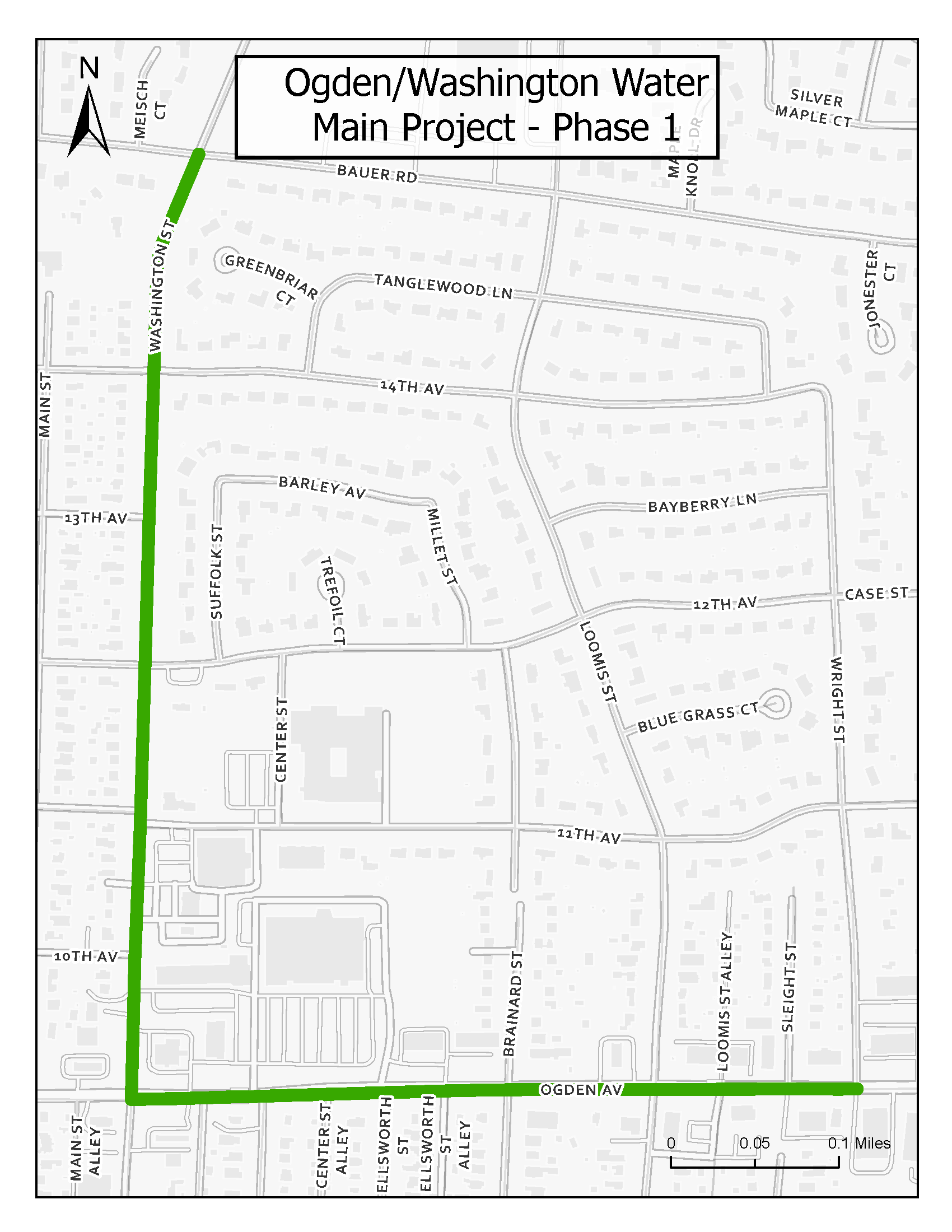 Project Details: (Updated April 17, 2026) During Phase I of this project, water mains were replaced on 11th Avenue. In Phase II, the City started replacing 8,200 feet of aging cast iron water main on the following streets: 14th Avenue, Bayberry Lane, East 12th Avenue, Greenbriar Court, Loomis Street, Tanglewood Lane and Wright Street.