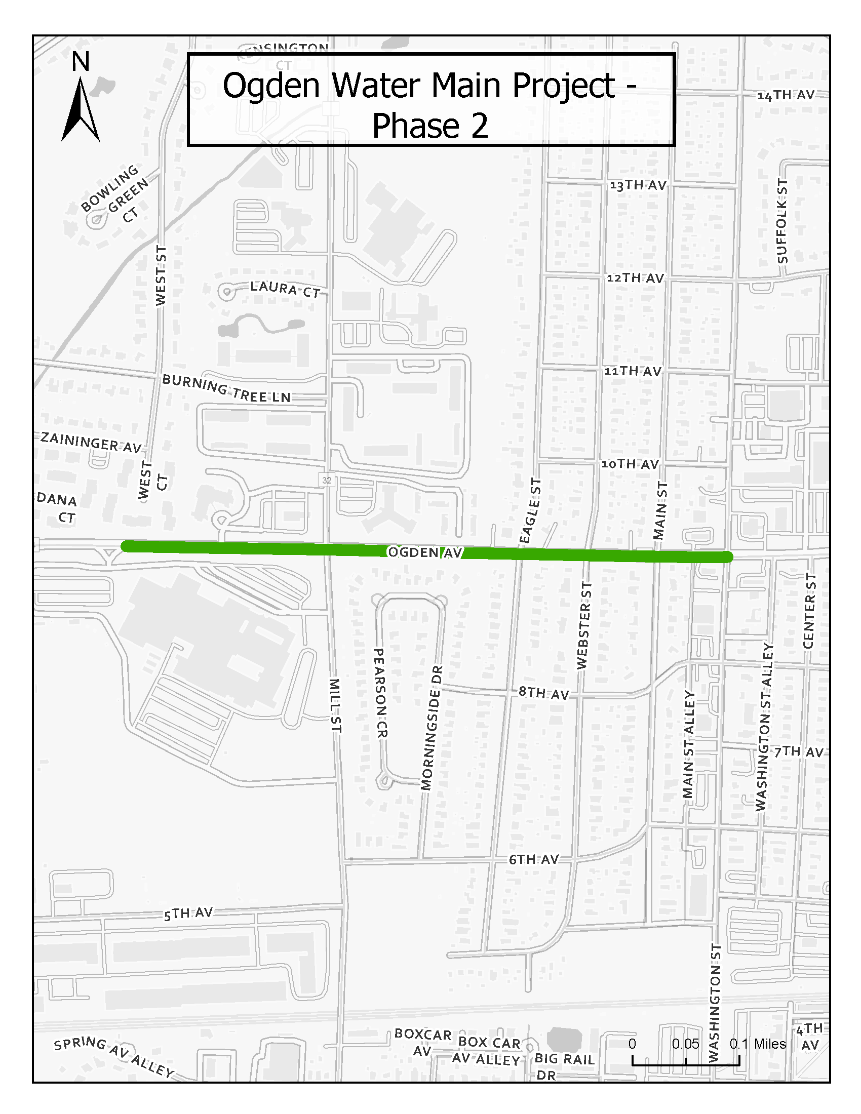 Project Details: The primary purpose of the project is to extend the new 16-inch water main west from the intersection of Ogden Avenue and Washington Street to approximately 1,000 feet west of Mill Street. This phase will install a new 16-inch water main in accordance with City standards to continue the improvements initiated in Phase 1 and enhance system reliability. Work will also include the replacement of the water valves, hydrants and services along the length of the water main. View a map of the impacted area.
